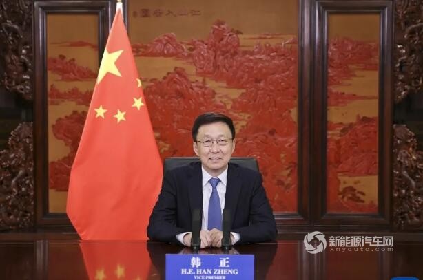 中共中央政治局常委、国务院副总理韩正于2021年9月16日在北京以视频方式出席2021世界新能源汽车大会并发表致辞。